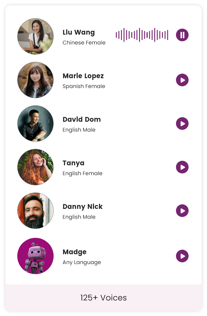 • Produce high quality, natural-sounding voiceover content in multiple languages, with a consistent tone and style, and in a more efficient manner, while also making it more accessible and personalized for the audience